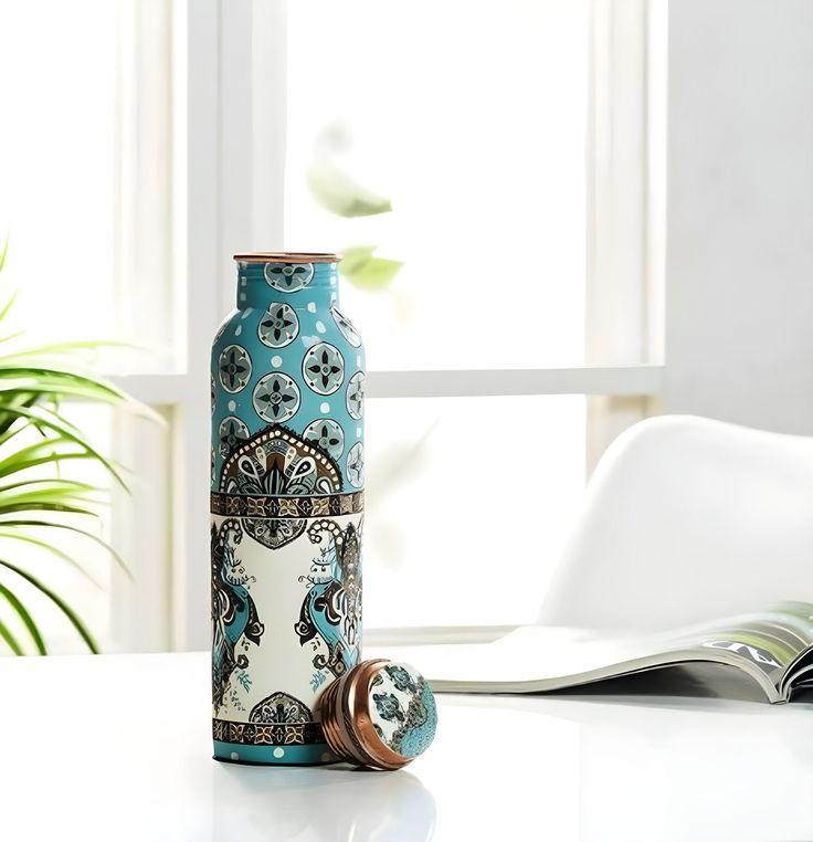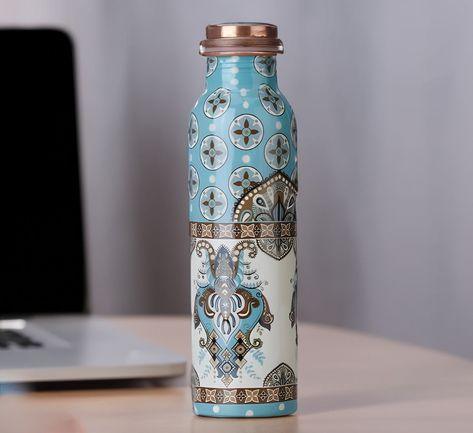 This handcrafted copper water bottle features an intricate mandala-inspired design in soothing blue and cream tones. Made with pure copper, it combines health benefits with artistic elegance. Ideal for daily hydration or as a thoughtful gift.
