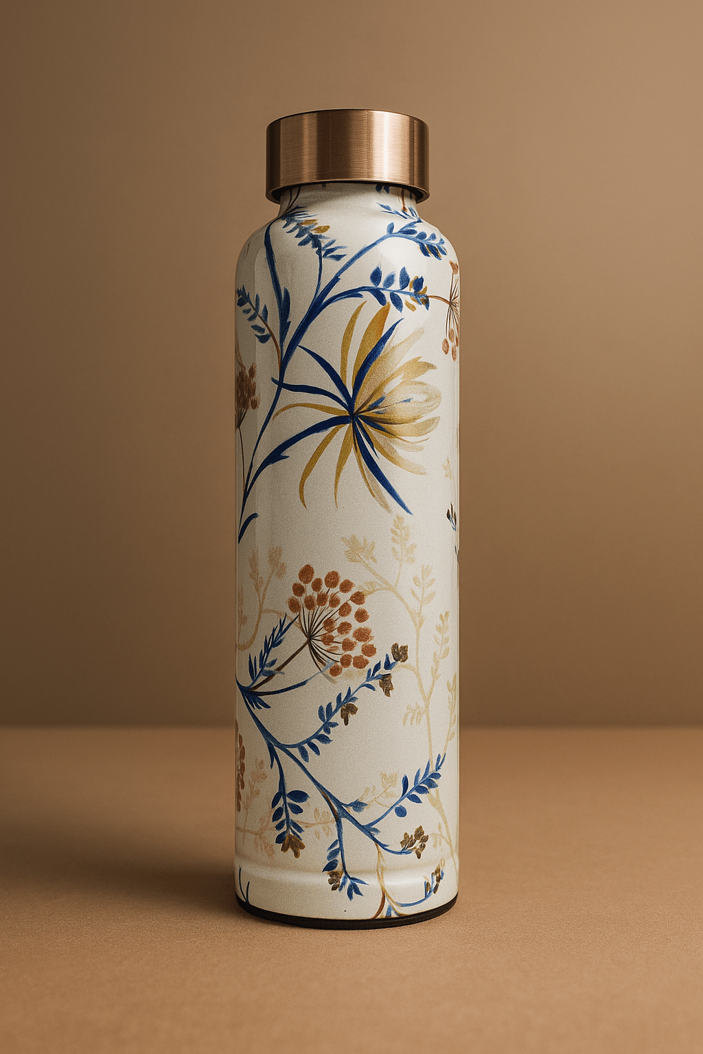 Embrace a healthier and more elegant way to hydrate with our Minakari Copper Water Bottle. This handcrafted 1-liter bottle is made from 99.6% pure copper and features a stunning floral print that reflects the intricate beauty of Minakari art.